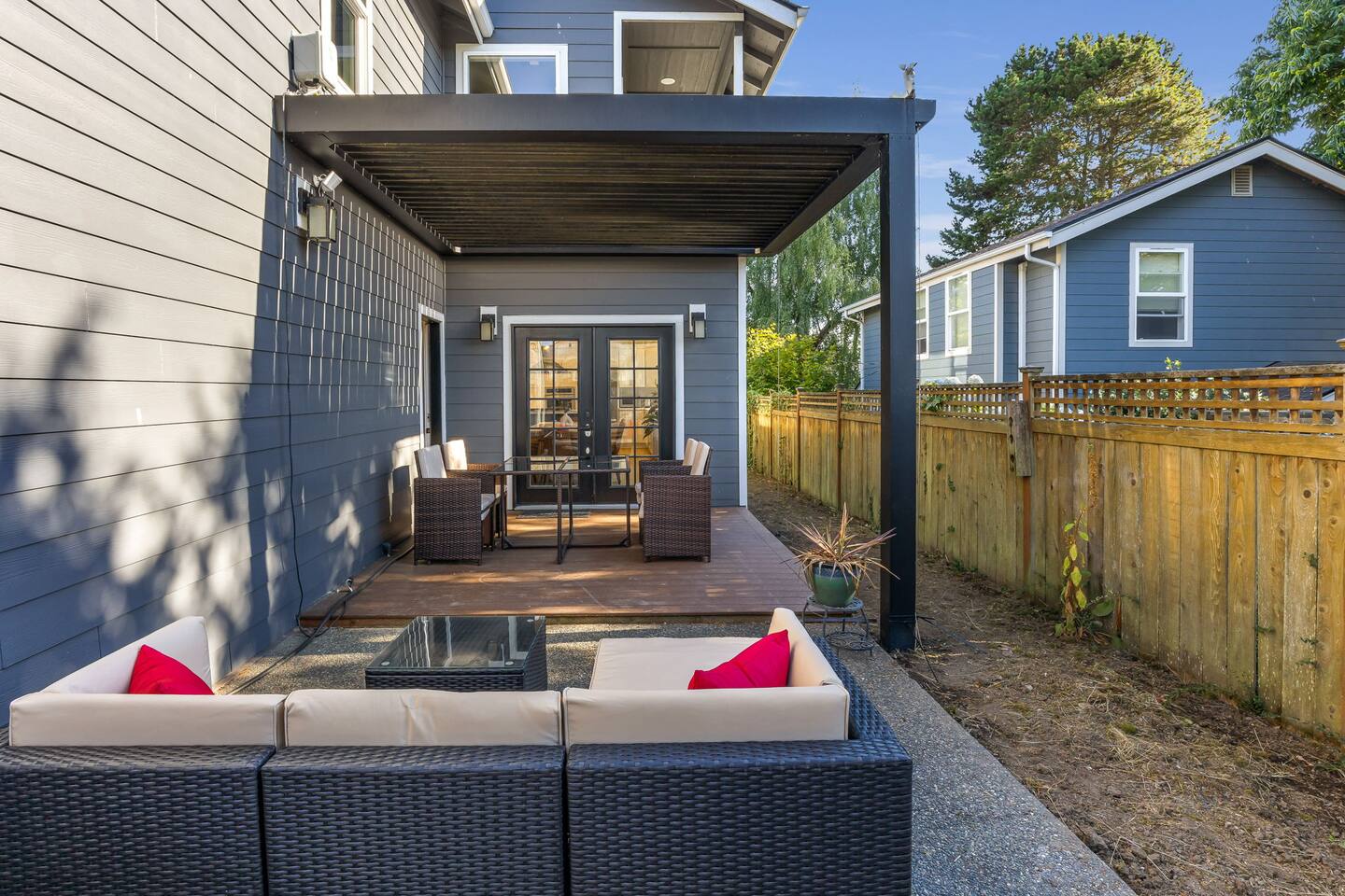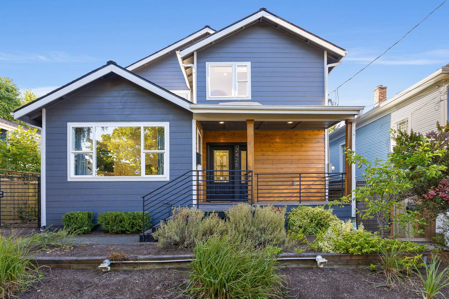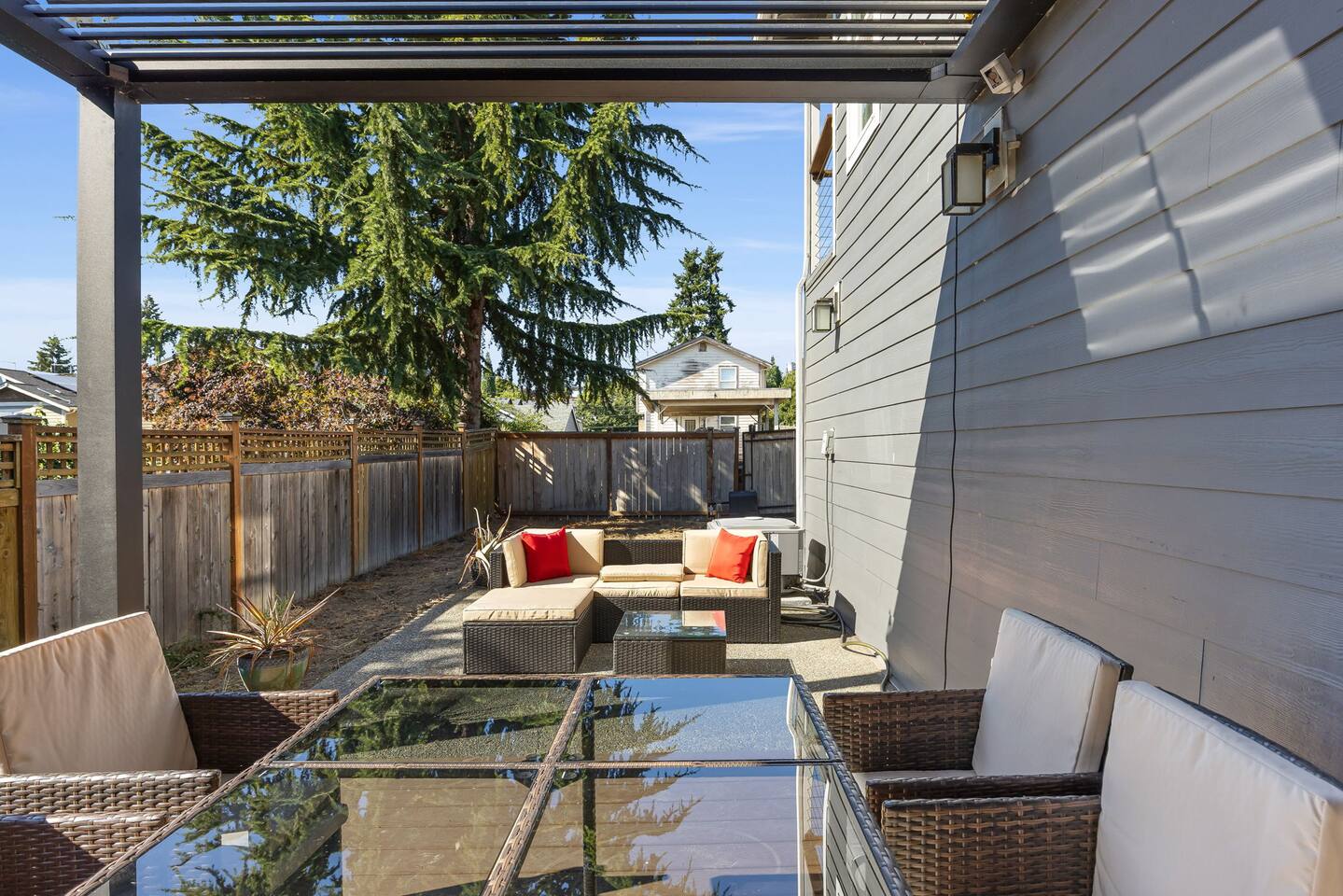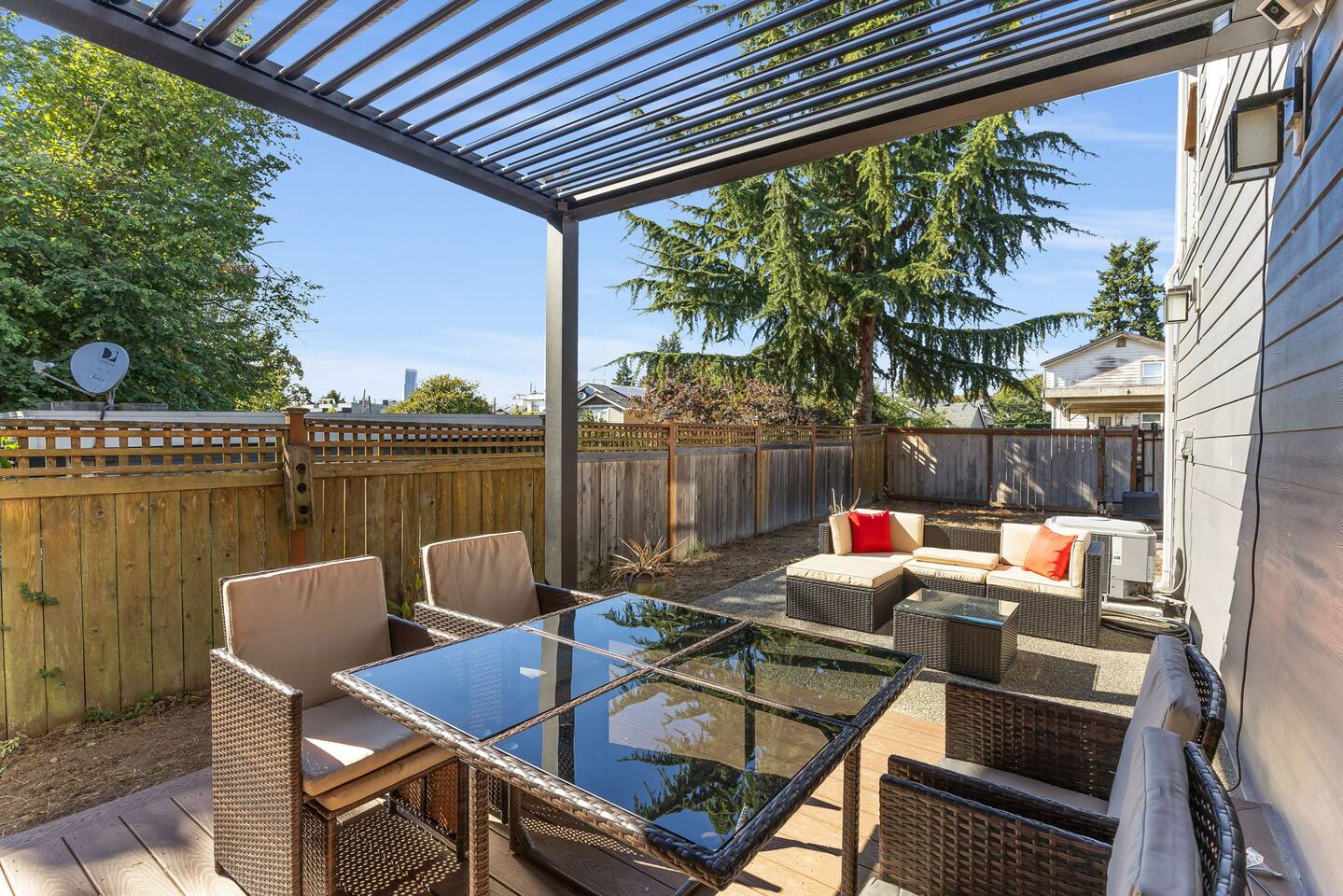 Beautiful 2-level 2500 sq ft single family home with 6 bedrooms, 3 bathrooms. We are 15 mins ride to all of Seattle's best attractions including Capitol Hill, Pike Place market, Space needle, T-mobile park. This is the perfect place for large groups to immerse themselves in the central vibe of Seattle. This beautiful home offers high-end amenities through and through! Relax at the end of your day in spacious living room w/ high end furniture, hotel-grade luxury bedding with fresh white linens & fluffy duvets. Free two car parking in driveway and plenty of street parking! Comes with rare central AC [First Floor]: - Home Entrance - Living Room w/ three sofas - Kitchen with island - Dining area with dining table (seats 14) - Bathroom #1: Full bathroom w/ tub - Bedroom #1: One queen bed - Bedroom #2: One queen bed [Second floor]: - Bedroom #3: One queen bed - Bedroom #4: One queen bed w/attached bathroom #2 -Bathroom #2: Full bathroom - Bedroom #5: Two queen beds - Bedroom #6: One queen bed - Bathroom #3: Full bathroom w/ shower [Exterior] Backyard with sofa Home Highlights: - Two dedicated parking spot in driveway - Stylish interior design and beautiful furniture in a luxury home with high-end finishes. - Hotel grade bedding for a comfortable sleep - Fully-stocked kitchen with Keurig coffee maker and coffee pods, pots, pans, bowls, plates, glasses and utensils - 65'' Smart TV with Hulu & Disney (no Cable) - High-speed WIFI (upto 1 Gbps) for all your working from home needs! - Washer/Dryer - Smarthome ready with electronic lock, and Ring security system. This house is close to everything: Capitol Hill -> 15 min drive Downtown Seattle/Pike Place Market -> 15 min drive Amazon Spheres -> 15 min drive Chinatown/International District -> 5 min drive T-mobile park -> 10 min drive Space Needle/Chihuly Glass museum/Olympic sculpture park -> 15 min Uber ride. Airport -> 25 min drive