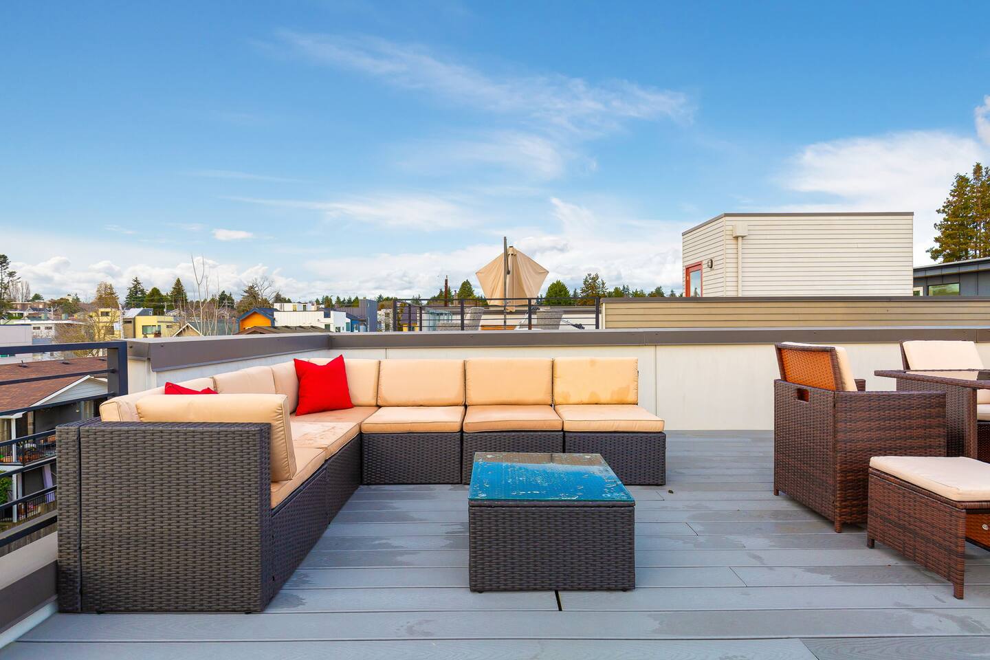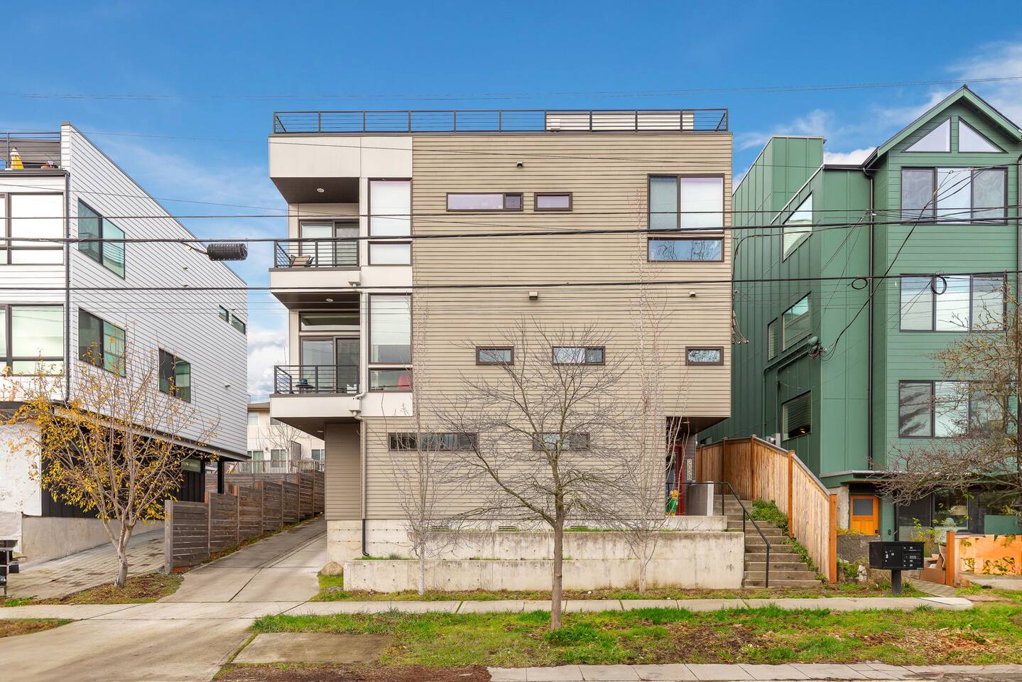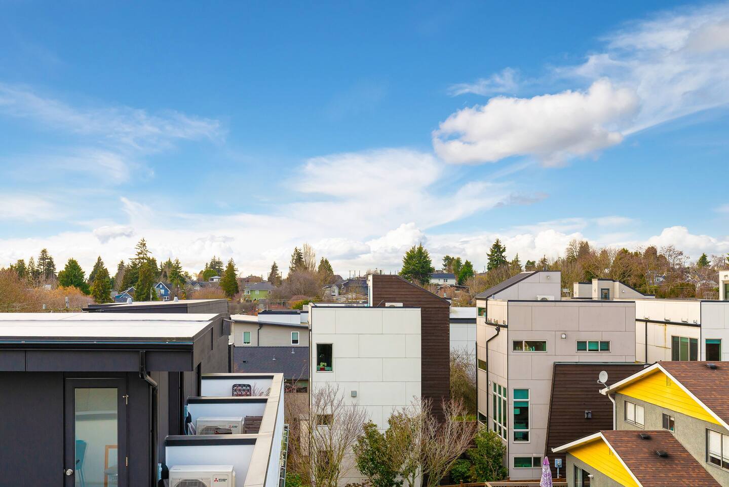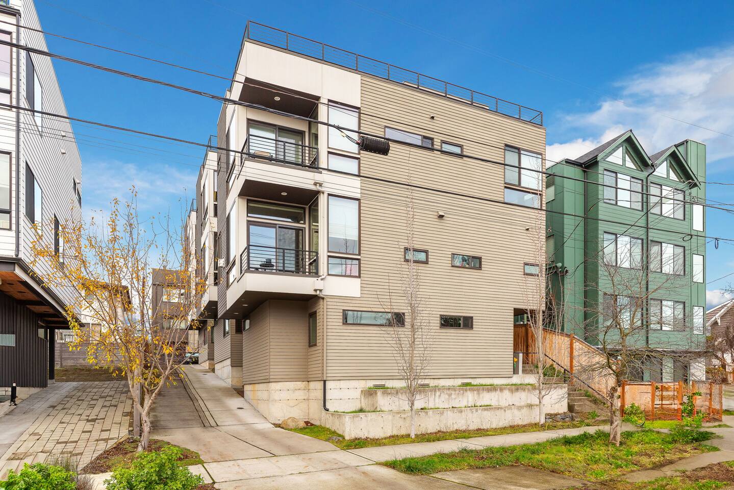 Find yourself nestled minutes drive away from downtown Ballard, close to the beautiful green lake area, and a quick Uber ride away from the Space Needle and Pikeplace. This home is the perfect spot to relax with friends and family after a day of exploring or WFH. Free parking available. Welcome home! Home Layout: [First Floor]: No portable AC, only fans as first floor is cooled by downdraft - Bedroom #1: One queen bed - Bedroom #2: One queen bed - Bathroom #1 [Second Floor]: portable AC - Living room with two sofas - Kitchen with dining table - Bathroom #2: Half bathroom [Third Floor]: portable AC - Bedroom #3: One queen bed - Bedroom #4: Two queen beds with attached bathroom [Others] - 1 parking spot - Deck on the 4th floor with outdoor furniture Home Highlights: - Stylish interior design and beautiful furniture in a luxury home with high-end finishes. - Hotel grade bedding for a comfortable sleep - Fully-stocked kitchen with Keurig coffee maker and coffee pods, pots, pans, bowls, plates, glasses and utensils - Smart TV with Hulu & Disney (no Cable) - High-speed WIFI (upto 1 Gbps) for all your working from home needs! - Heated flooring on first floor - wow! - Washer/Dryer - Smarthome ready with Nest, electronic lock, and Ring security system. This beautiful luxury home offers high-end amenities through and through. Conveniently situated in Ballard with breathtaking city views with Mt Rainer and Olympic mountain views visible on clear days. This architectural beauty is the perfect spot from which to explore Seattle's hottest attractions! Downtown Ballard -> 5 min walk Woodland Zoo/Greenlake -> 30 min walk or 7 min Uber ride Space Needle/Chihuly Glass museum/Olympic sculpture park -> 15 min Uber ride. Pike Place Market -> 20 min Uber ride. Amazon Spheres -> 20min Uber ride Airport -> 33 min drive