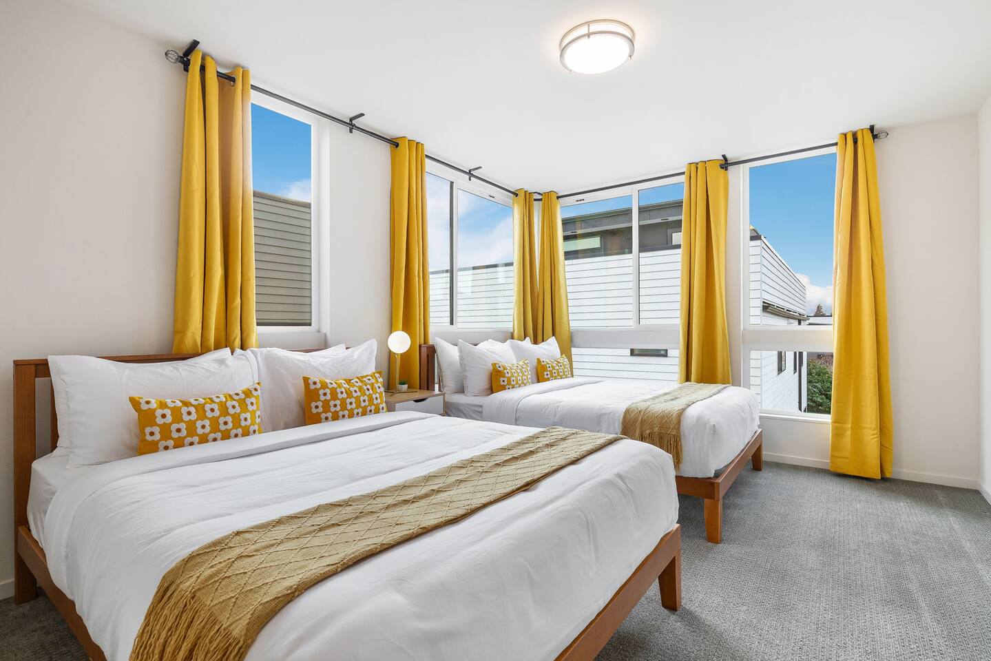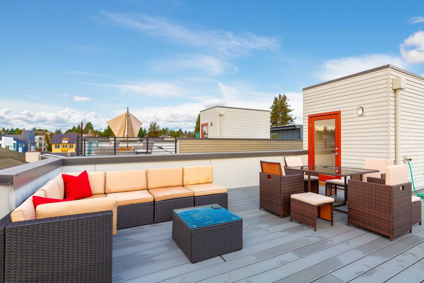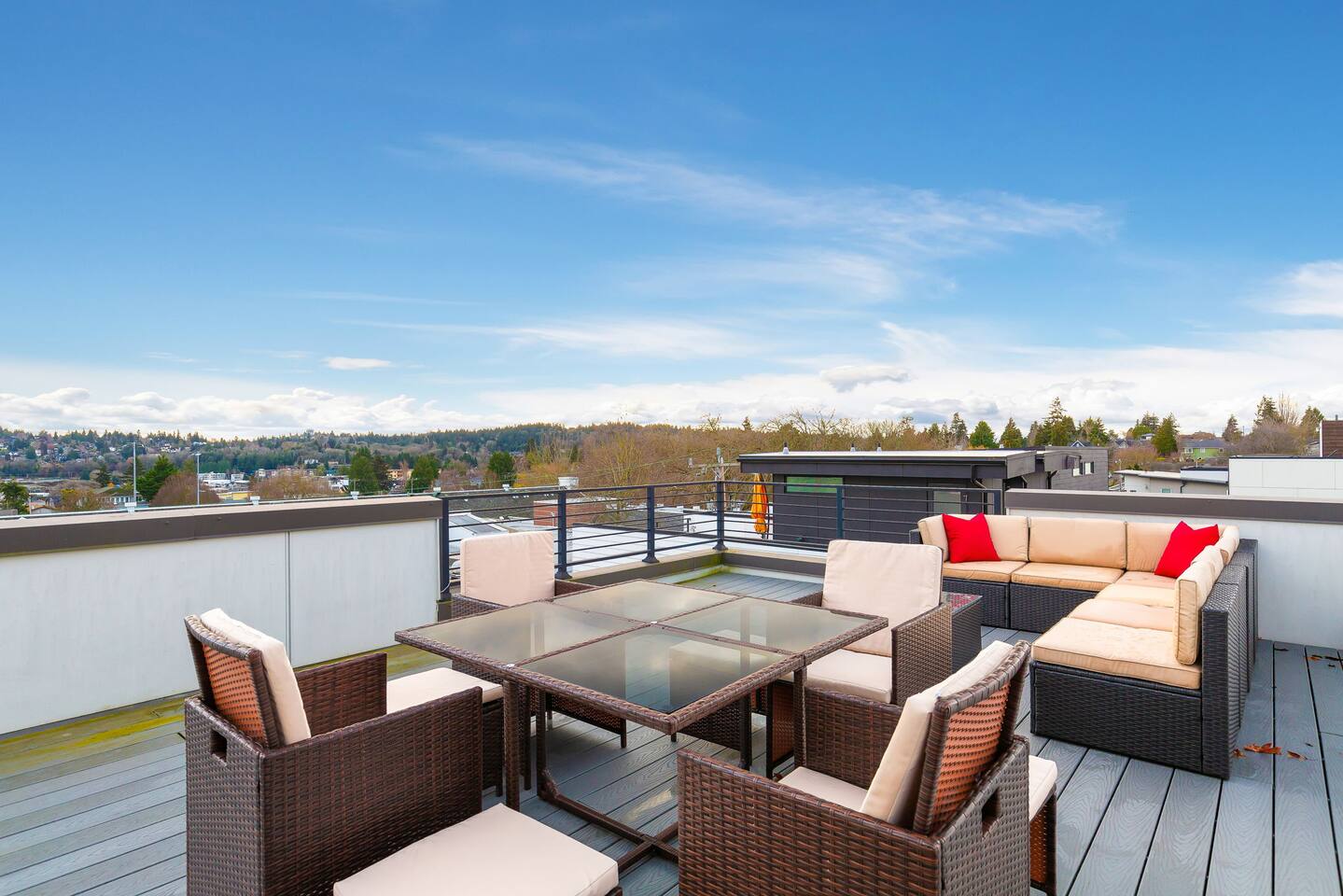 Find yourself nestled minutes drive away from downtown Ballard, close to the beautiful green lake area, and a quick Uber ride away from the Space Needle and Pikeplace. This home is the perfect spot to relax with friends and family after a day of exploring or WFH. Free parking available. Welcome home! Home Layout: [First Floor]: No portable AC, only fans as first floor is cooled by downdraft - Bedroom #1: One queen bed - Bedroom #2: One queen bed - Bathroom #1 [Second Floor]: portable AC - Living room with two sofas - Kitchen with dining table - Bathroom #2: Half bathroom [Third Floor]: portable AC - Bedroom #3: One queen bed - Bedroom #4: Two queen beds with attached bathroom [Others] - 1 parking spot - Deck on the 4th floor with outdoor furniture Home Highlights: - Stylish interior design and beautiful furniture in a luxury home with high-end finishes. - Hotel grade bedding for a comfortable sleep - Fully-stocked kitchen with Keurig coffee maker and coffee pods, pots, pans, bowls, plates, glasses and utensils - Smart TV with Hulu & Disney (no Cable) - High-speed WIFI (upto 1 Gbps) for all your working from home needs! - Heated flooring on first floor - wow! - Washer/Dryer - Smarthome ready with Nest, electronic lock, and Ring security system. This beautiful luxury home offers high-end amenities through and through. Conveniently situated in Ballard with breathtaking city views with Mt Rainer and Olympic mountain views visible on clear days. This architectural beauty is the perfect spot from which to explore Seattle's hottest attractions! Downtown Ballard -> 5 min walk Woodland Zoo/Greenlake -> 30 min walk or 7 min Uber ride Space Needle/Chihuly Glass museum/Olympic sculpture park -> 15 min Uber ride. Pike Place Market -> 20 min Uber ride. Amazon Spheres -> 20min Uber ride Airport -> 33 min drive