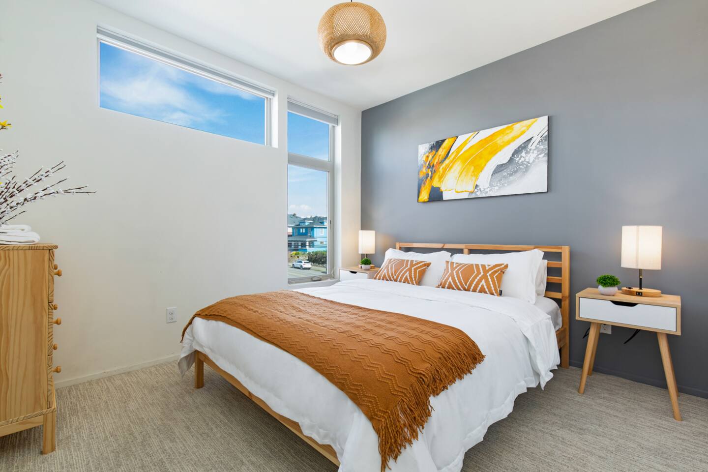 Find yourself nestled minutes drive away from downtown Ballard, close to the beautiful green lake area, and a quick Uber ride away from the Space Needle and Pikeplace. This home is the perfect spot to relax with friends and family after a day of exploring or WFH. Free parking available. Welcome home! Home Layout: [First Floor]: No portable AC, only fans as first floor is cooled by downdraft - Bedroom #1: One queen bed with attached bathroom. [Second Floor]: One portable AC - Living room with two sofas - Kitchen with dining table [Third Floor]: One portable AC in each bedroom - Bedroom #2: One queen bed with attached bathroom - Bedroom #3: One queen bed with separate bathroom [Others] - 1 parking spot in front of the garage with level 2 (240v) charging outlet for your electric vehicle. Note: please bring your own Nema 14-50 chargers as we do not provide the actual charger/cable. - Deck on the 4th floor with outdoor furniture Home Highlights: - Stylish interior design and beautiful furniture in a luxury home with high-end finishes. - Hotel grade bedding for a comfortable sleep - Fully-stocked kitchen with Nespresso coffee maker and coffee pods, pots, pans, bowls, plates, glasses and utensils - Smart TV with Hulu & Disney (no Cable) - High-speed WIFI (upto 1 Gbps) for all your working from home needs! - Heated flooring on first floor - wow! - Washer/Dryer - Japanese bidet toilet in master bathroom - Level 2 (240v) fast charging outlet for overnight charging (no cable/charger provided). - Smarthome ready with Nest, electronic lock, and Ring security system. - Bathrooms for every bedroom. This beautiful luxury home offers high-end amenities through and through. Conveniently situated in Ballard with breathtaking city views with Mt Rainer and Olympic mountain views visible on clear days. This architectural beauty is the perfect spot from which to explore Seattle's hottest attractions! Downtown Ballard -> 5 min walk Woodland Zoo/Greenlake -> 30 min walk or 7 min Uber ride Space Needle/Chihuly Glass museum/Olympic sculpture park -> 15 min Uber ride. Pike Place Market -> 20 min Uber ride. Amazon Spheres -> 20min Uber ride Airport -> 33 min drive