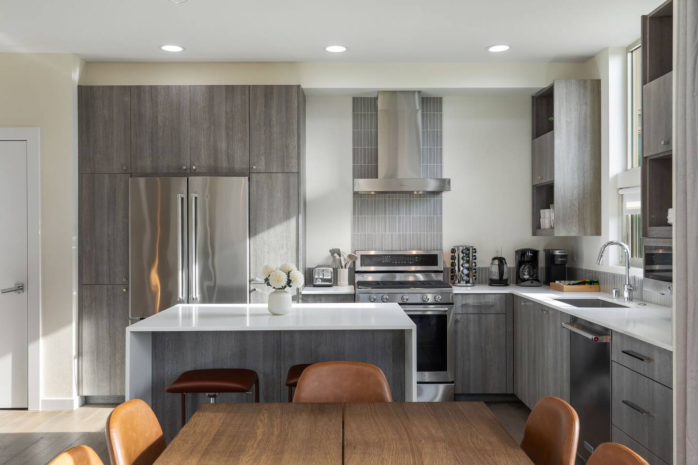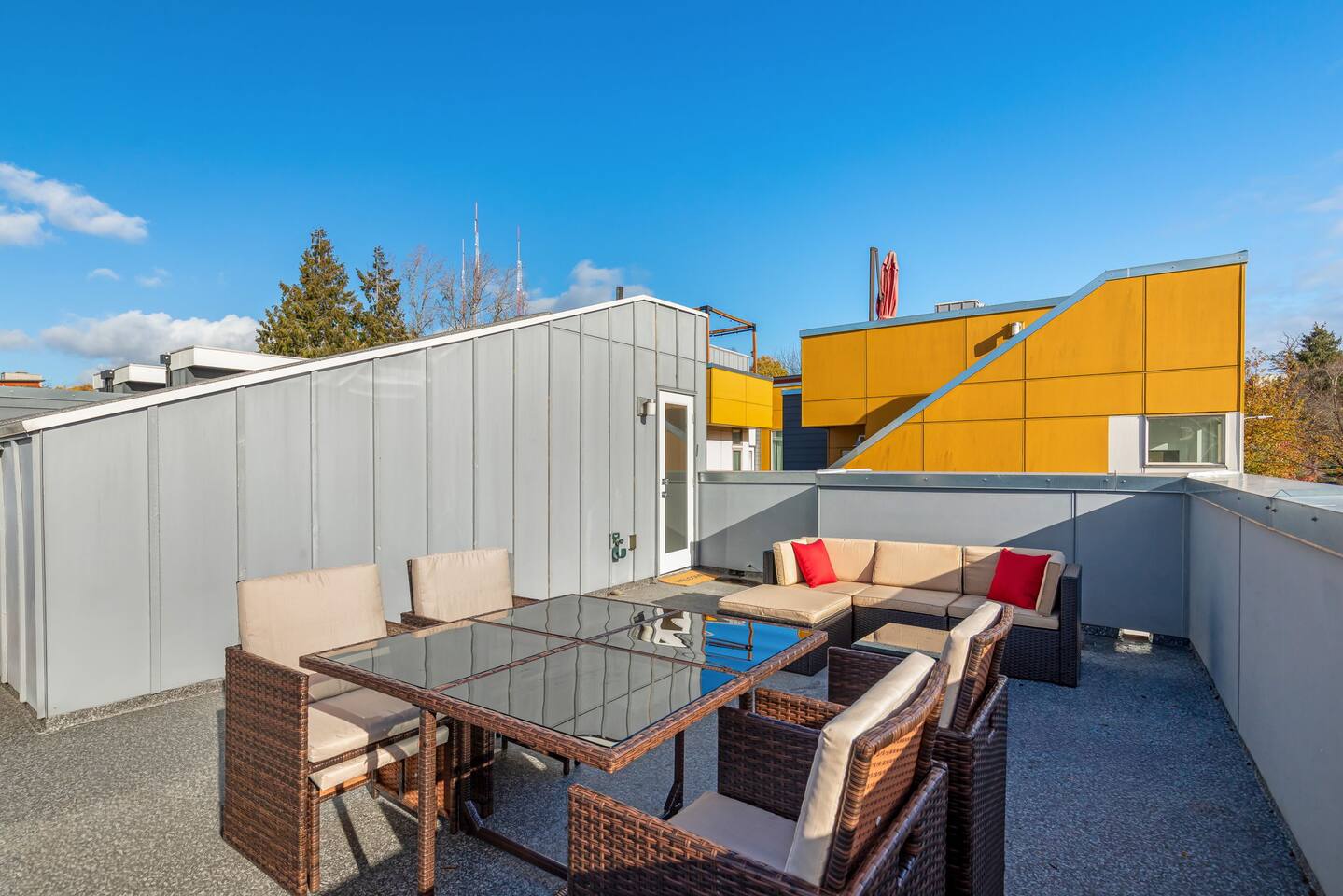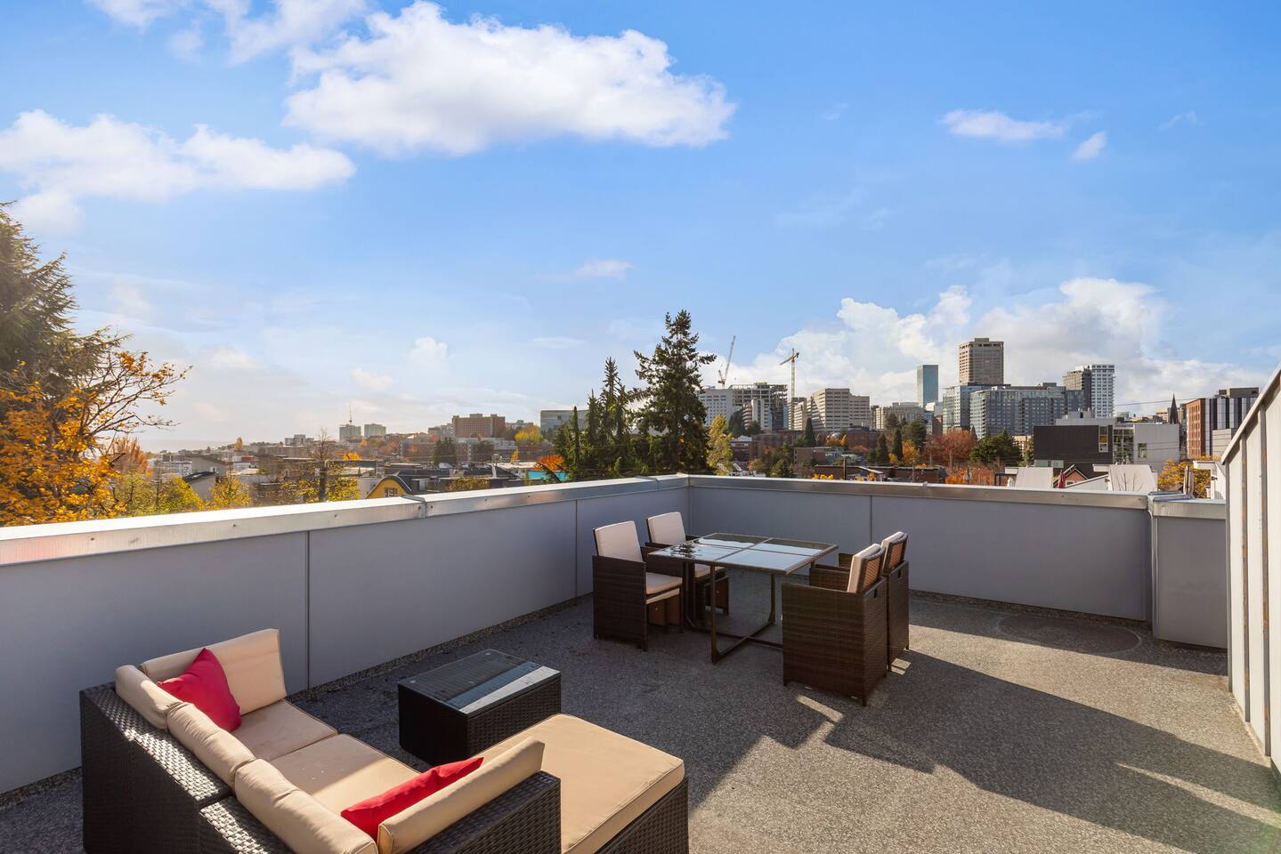 Beautiful 4-level 1900 sq ft townhouse with 4 bedrooms. We are a short walk to Capitol Hill and its fabulous award winning restaurants and a quick Uber ride to Pike Place Market, SLU, Queen Anne This is the perfect place for tourists to immerse themselves in the central vibe of Seattle. This beautiful luxury home offers high-end amenities through and through! Lay back on the rooftop deck with views of Seattle downtown skyline. Relax at the end of your day in high end furniture, hotel-grade luxury bedding with fresh white linens & fluffy duvets. Free one car parking! Home Layout: [First Floor] - Bedroom #1: Three queen bed with attached bathroom [Second Floor] - Living room with two sofas - Kitchen with island and dining table [Third Floor] - Bedroom #1: One queen bed - Bedroom #2: One queen bed - Bathroom #1: Full bathroom w/ tub and shower [Fourth floor] - Rooftop deck Home Highlights: - Stylish interior design and beautiful furniture in a luxury home with high-end finishes. - Hotel grade bedding for a comfortable sleep - Fully-stocked kitchen with Keurig coffee maker and coffee pods, pots, pans, bowls, plates, glasses and utensils - 65'' Smart TV with Hulu & Disney (no Cable) - High-speed WIFI (upto 1 Gbps) for all your working from home needs! - Washer/Dryer - Smarthome ready with electronic lock, and Ring security system. This house is close to everything: Capitol Hill -> 15 min walk /5 min drive Downtown Seattle/Pike Place Market -> 10 min Uber ride. Amazon Spheres -> 10 min Uber ride Chinatown/International District -> 5 min Uber ride Space Needle/Chihuly Glass museum/Olympic sculpture park -> 11 min Uber ride. Airport -> 25 min drive
