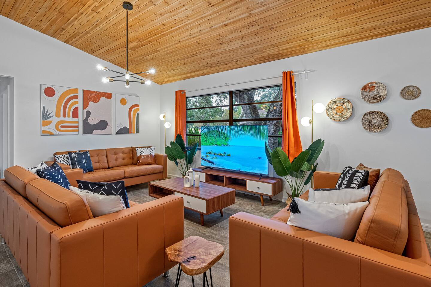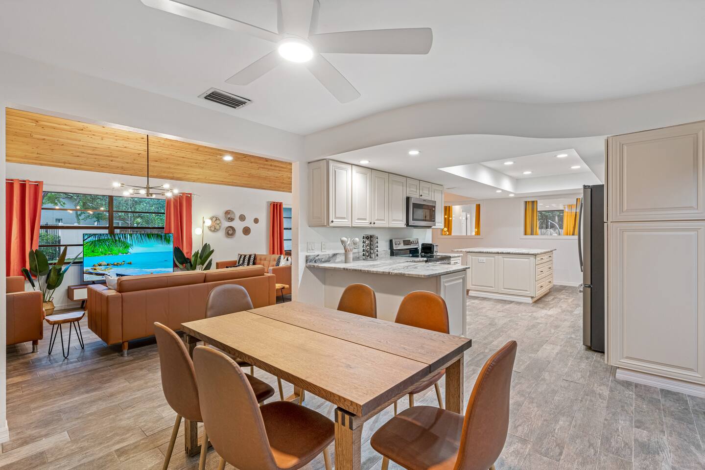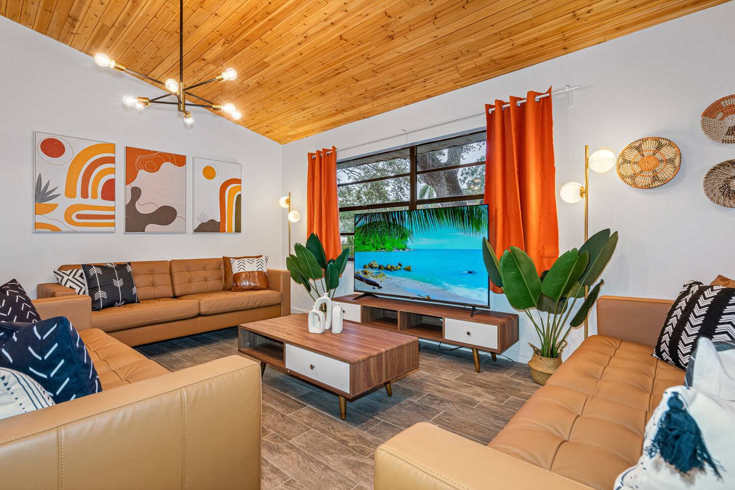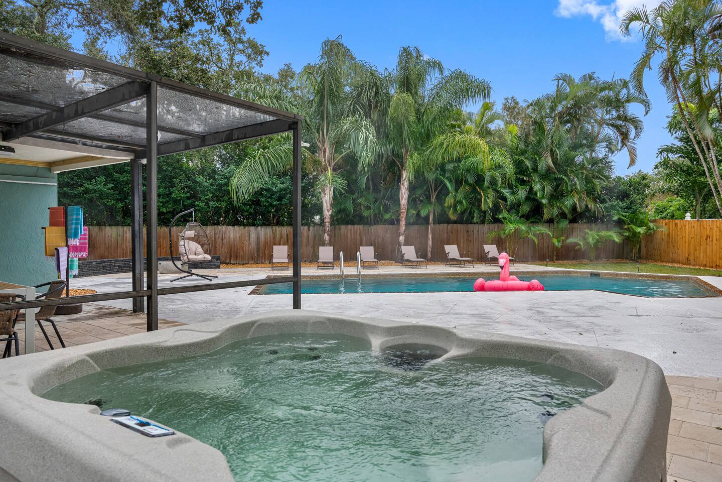 Beautiful single story stunning 2200 sq ft home with 5 bedrooms, heated swimming pool, hot tub, and firepit. We are 10 mins drive to award winning Indian Shores beach, Madeira beach and 15 mins to Clearwater. This is the perfect place for tourists to immerse themselves in the beach vibes of Seminole. This beautiful luxury home offers high-end amenities through and through! Free street parking available in plenty! Home Layout: - Living Room #1: One Sofa with 65' TV - Dining Table seating 10 - Kitchen w/ breakfast table seating 6 - Bedroom #1: One queen bed - Bedroom #2: One queen bed - Bathroom #1: Common bathroom for bedroom #1 and #2 - Bedroom #3: One queen bed w/ attached bathroom #2 - Bathroom #2 - Bedroom #4/5: Three queen beds.bBedrooms share same entry and attached bathroom #3 - Bathroom #3 [Outdoor] - Heated Swimming pool set to 83-85F with outdoor table and reclining chairs - Fire pit - Hot tub - 4 car driveway parking Home Highlights: - Stylish interior design and beautiful furniture in a luxury home with high-end finishes. - Hotel grade bedding for a comfortable sleep - 65' TVs with Hulu & Disney (no cable) - Fully-stocked kitchen with Keurig coffee maker and coffee pods, pots, pans, bowls, plates, glasses and utensils - High-speed WIFI (upto 1 Gbps) for all your working from home needs! - Washer/Dryer - Smarthome ready with electronic lock, and Ring security system. This house is close to everything: Airport -> 30 min drive Madeira Beach -> 5 min drive Indian Shores -> 10 min drive Indian Rocks Beach -> 15 min drive Clearwater beach -> 25 min drive