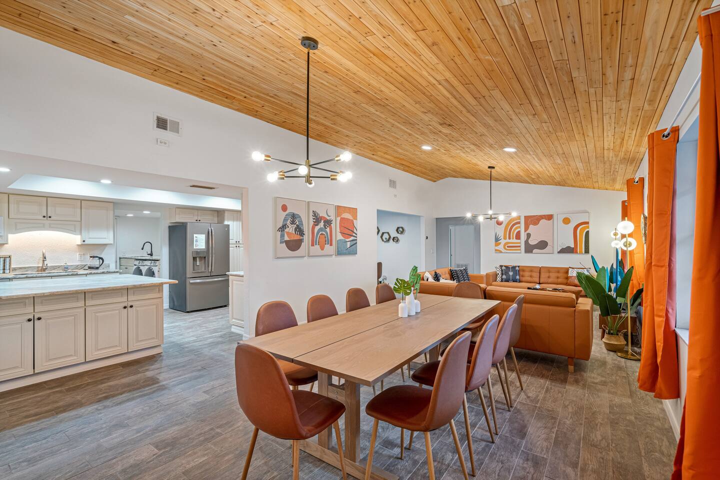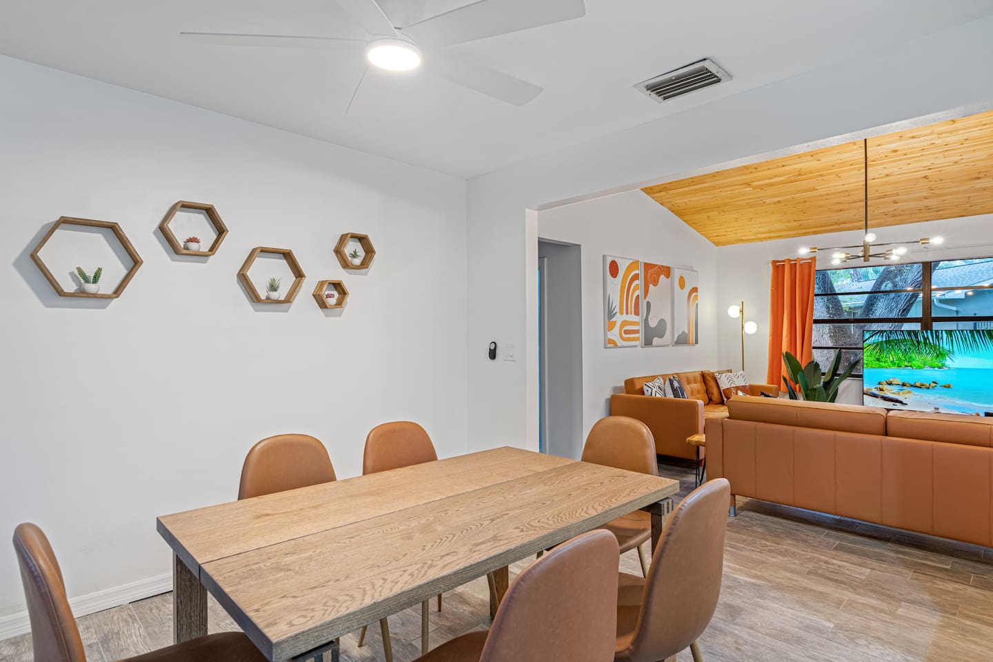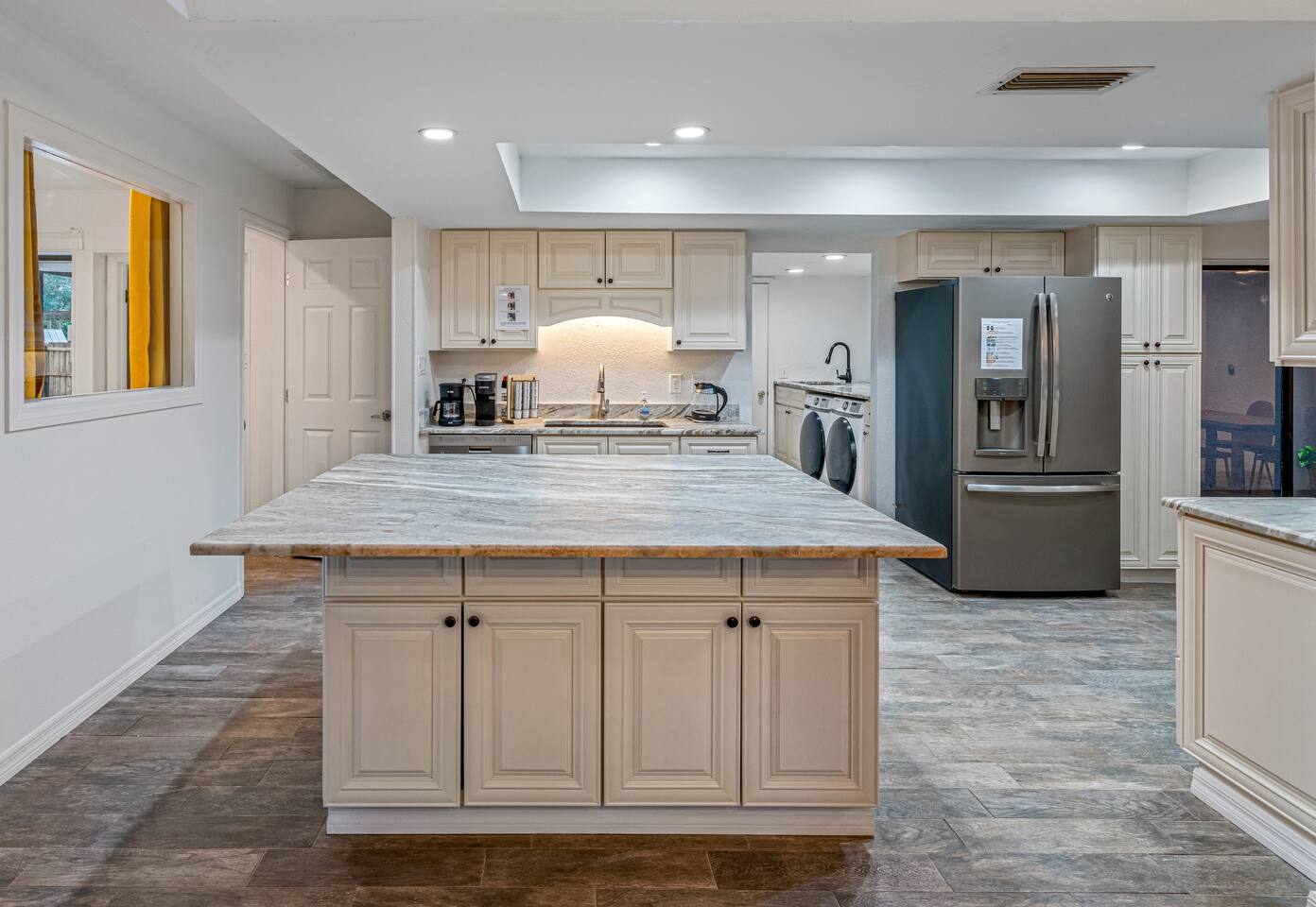 Beautiful single story stunning 2200 sq ft home with 5 bedrooms, heated swimming pool, hot tub, and firepit. We are 10 mins drive to award winning Indian Shores beach, Madeira beach and 15 mins to Clearwater. This is the perfect place for tourists to immerse themselves in the beach vibes of Seminole. This beautiful luxury home offers high-end amenities through and through! Free street parking available in plenty! Home Layout: - Living Room #1: One Sofa with 65' TV - Dining Table seating 10 - Kitchen w/ breakfast table seating 6 - Bedroom #1: One queen bed - Bedroom #2: One queen bed - Bathroom #1: Common bathroom for bedroom #1 and #2 - Bedroom #3: One queen bed w/ attached bathroom #2 - Bathroom #2 - Bedroom #4/5: Three queen beds.bBedrooms share same entry and attached bathroom #3 - Bathroom #3 [Outdoor] - Heated Swimming pool set to 83-85F with outdoor table and reclining chairs - Fire pit - Hot tub - 4 car driveway parking Home Highlights: - Stylish interior design and beautiful furniture in a luxury home with high-end finishes. - Hotel grade bedding for a comfortable sleep - 65' TVs with Hulu & Disney (no cable) - Fully-stocked kitchen with Keurig coffee maker and coffee pods, pots, pans, bowls, plates, glasses and utensils - High-speed WIFI (upto 1 Gbps) for all your working from home needs! - Washer/Dryer - Smarthome ready with electronic lock, and Ring security system. This house is close to everything: Airport -> 30 min drive Madeira Beach -> 5 min drive Indian Shores -> 10 min drive Indian Rocks Beach -> 15 min drive Clearwater beach -> 25 min drive