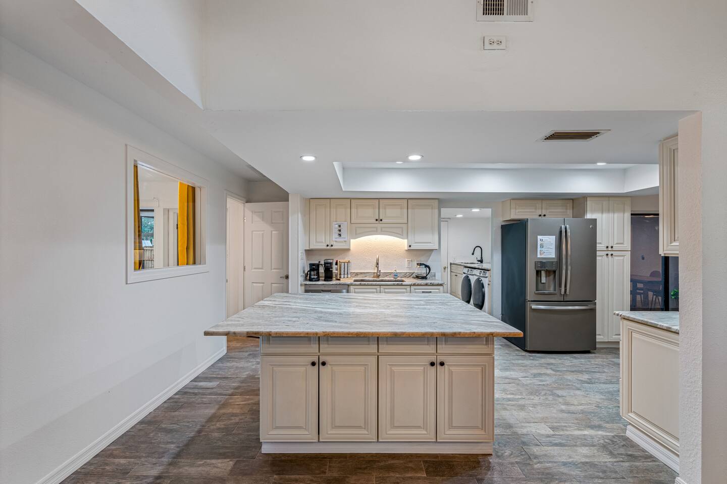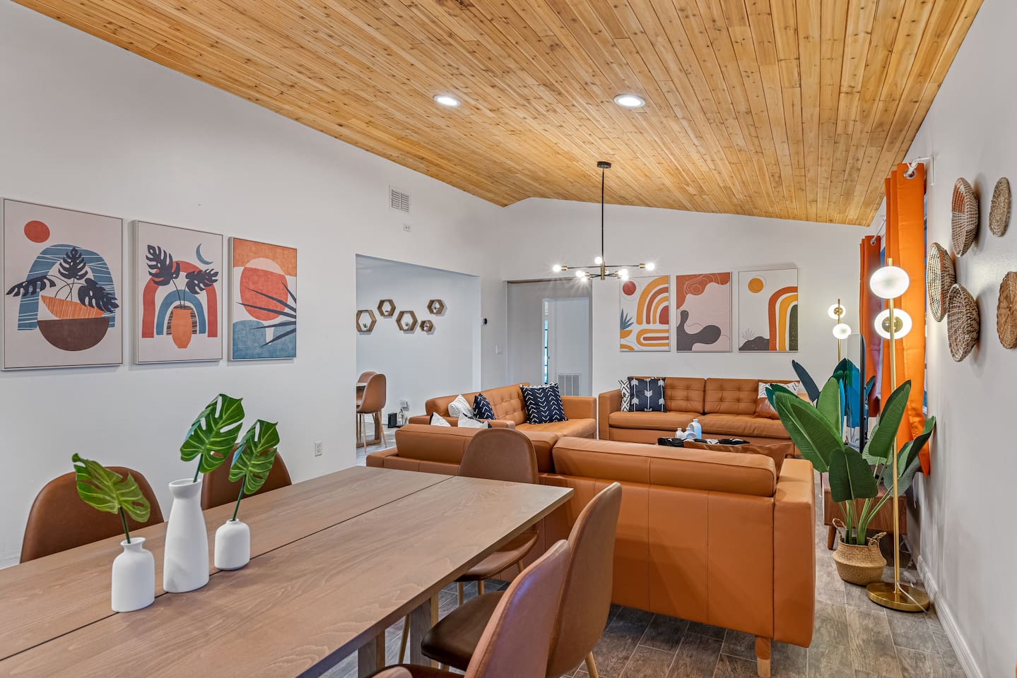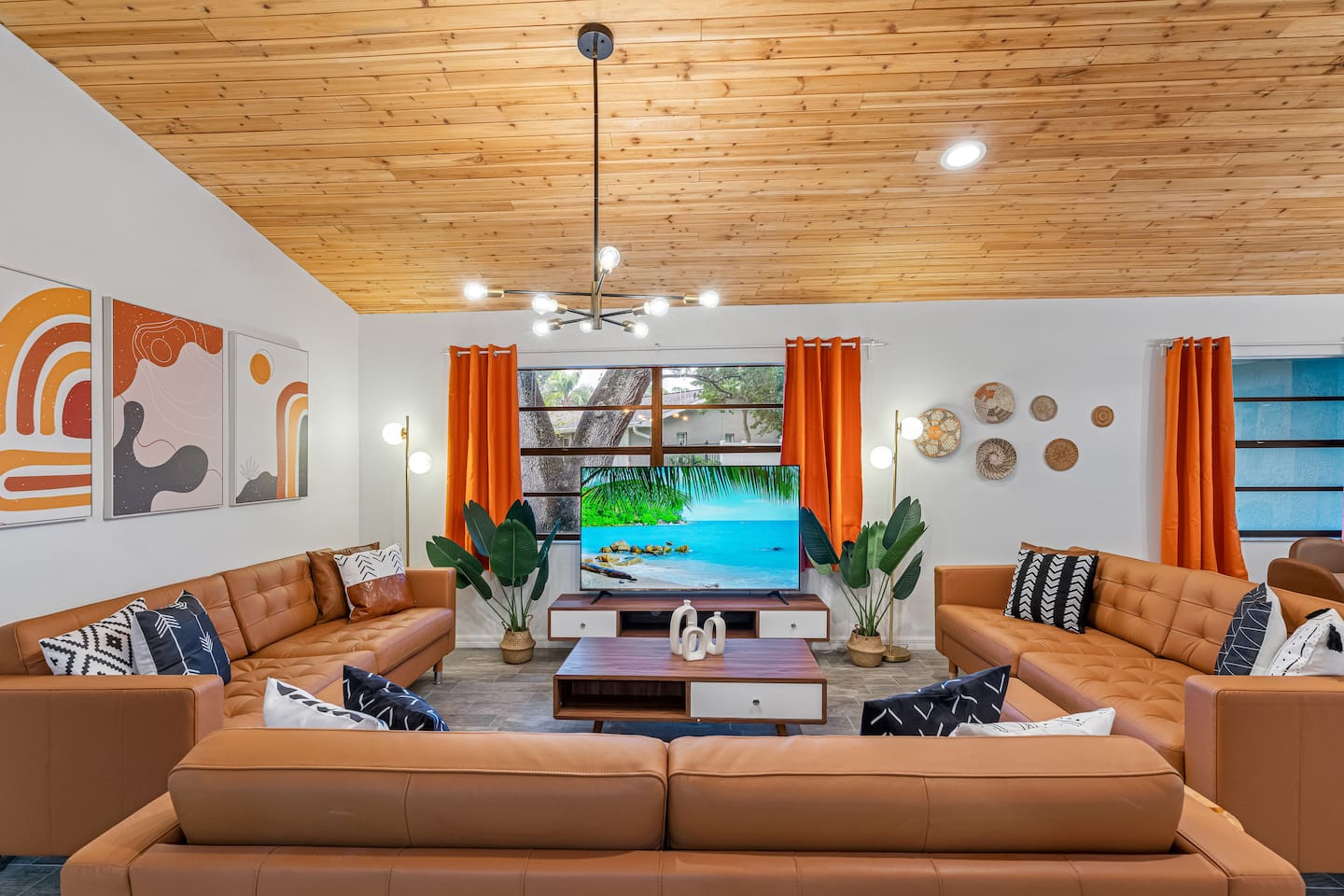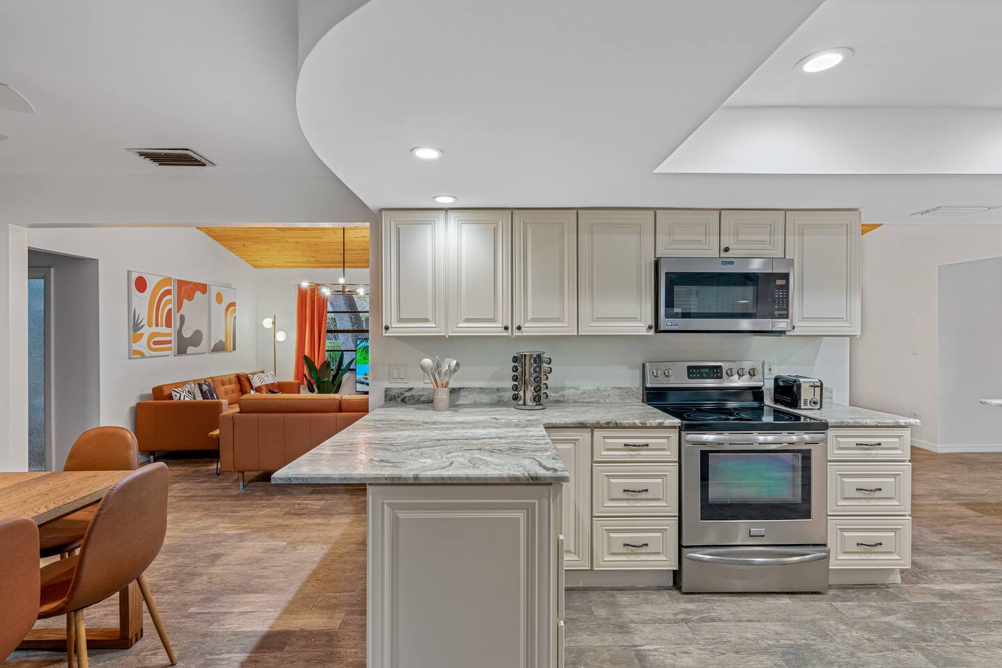 Beautiful single story stunning 2200 sq ft home with 5 bedrooms, heated swimming pool, hot tub, and firepit. We are 10 mins drive to award winning Indian Shores beach, Madeira beach and 15 mins to Clearwater. This is the perfect place for tourists to immerse themselves in the beach vibes of Seminole. This beautiful luxury home offers high-end amenities through and through! Free street parking available in plenty! Home Layout: - Living Room #1: One Sofa with 65' TV - Dining Table seating 10 - Kitchen w/ breakfast table seating 6 - Bedroom #1: One queen bed - Bedroom #2: One queen bed - Bathroom #1: Common bathroom for bedroom #1 and #2 - Bedroom #3: One queen bed w/ attached bathroom #2 - Bathroom #2 - Bedroom #4/5: Three queen beds.bBedrooms share same entry and attached bathroom #3 - Bathroom #3 [Outdoor] - Heated Swimming pool set to 83-85F with outdoor table and reclining chairs - Fire pit - Hot tub - 4 car driveway parking Home Highlights: - Stylish interior design and beautiful furniture in a luxury home with high-end finishes. - Hotel grade bedding for a comfortable sleep - 65' TVs with Hulu & Disney (no cable) - Fully-stocked kitchen with Keurig coffee maker and coffee pods, pots, pans, bowls, plates, glasses and utensils - High-speed WIFI (upto 1 Gbps) for all your working from home needs! - Washer/Dryer - Smarthome ready with electronic lock, and Ring security system. This house is close to everything: Airport -> 30 min drive Madeira Beach -> 5 min drive Indian Shores -> 10 min drive Indian Rocks Beach -> 15 min drive Clearwater beach -> 25 min drive